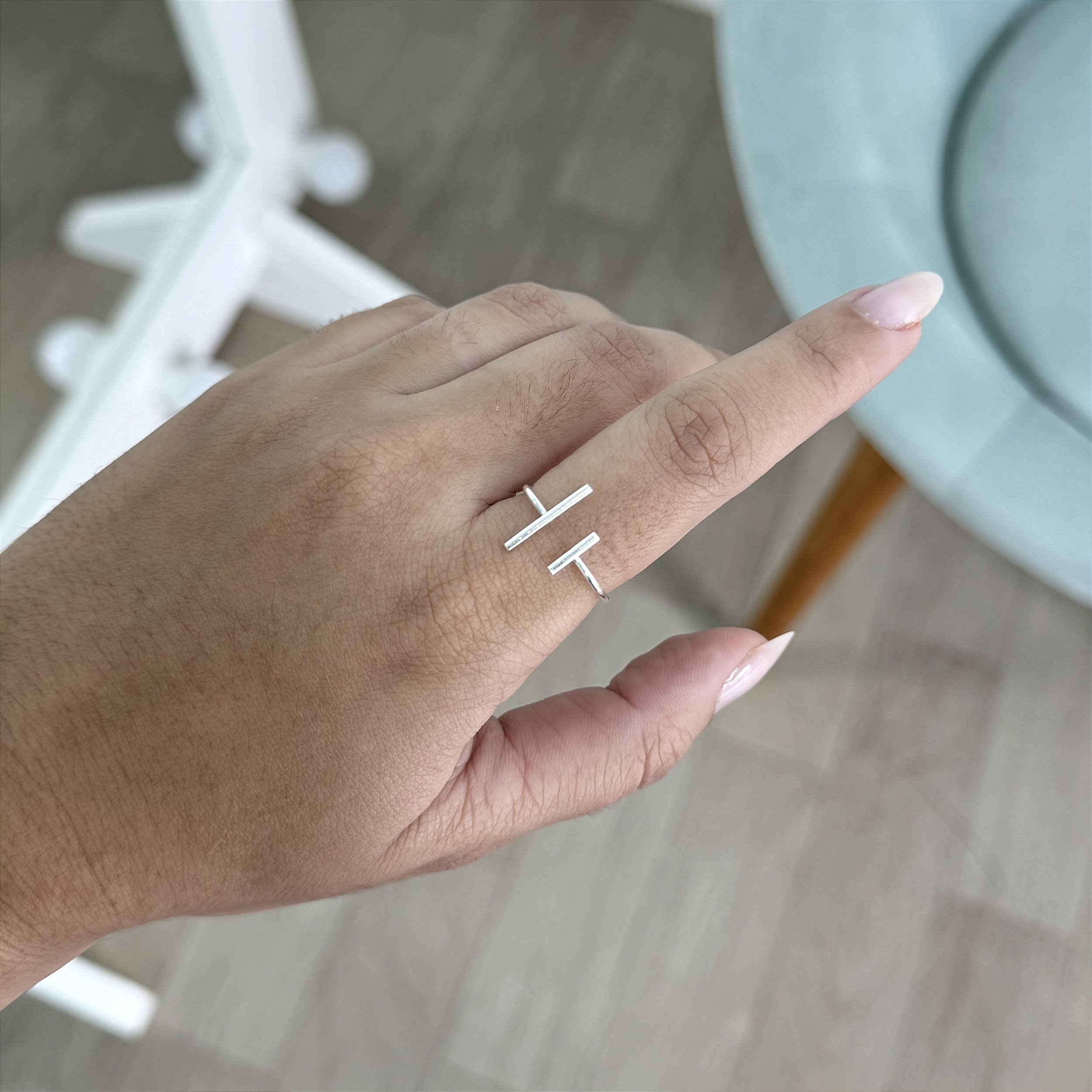 Com dois traços delicados e elegantes, este anel combina um estilo minimalista com um toque de sofisticação. O design regulável permite que o anel se ajuste perfeitamente ao tamanho do seu dedo, garantindo conforto e um ajuste personalizado.